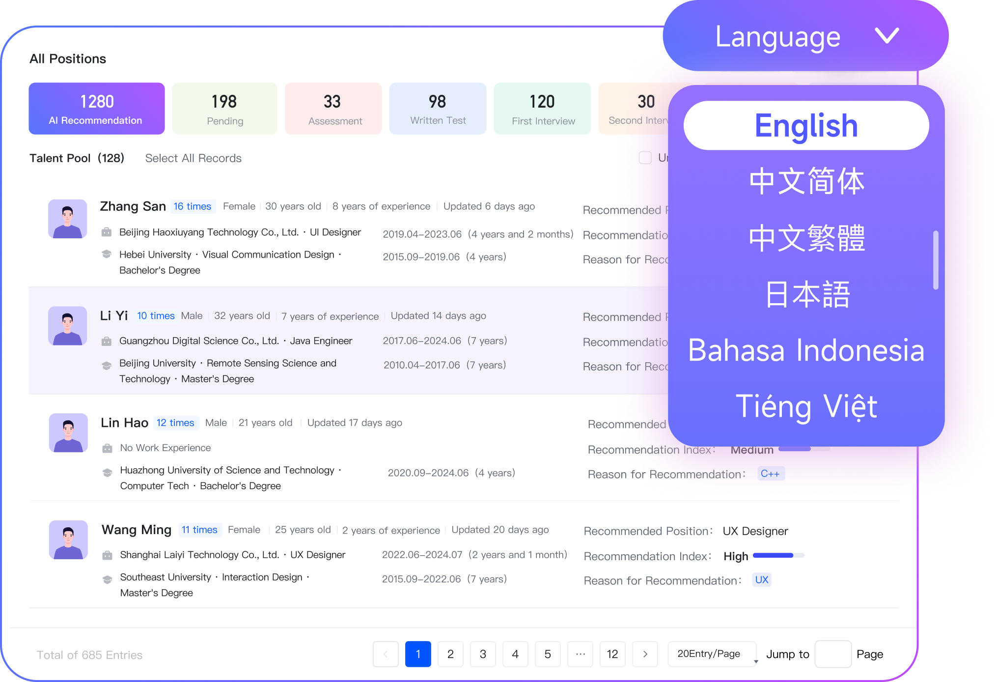 支持中繁/日/英/越等多语言系统,消除语言障碍,招聘流程高效无阻